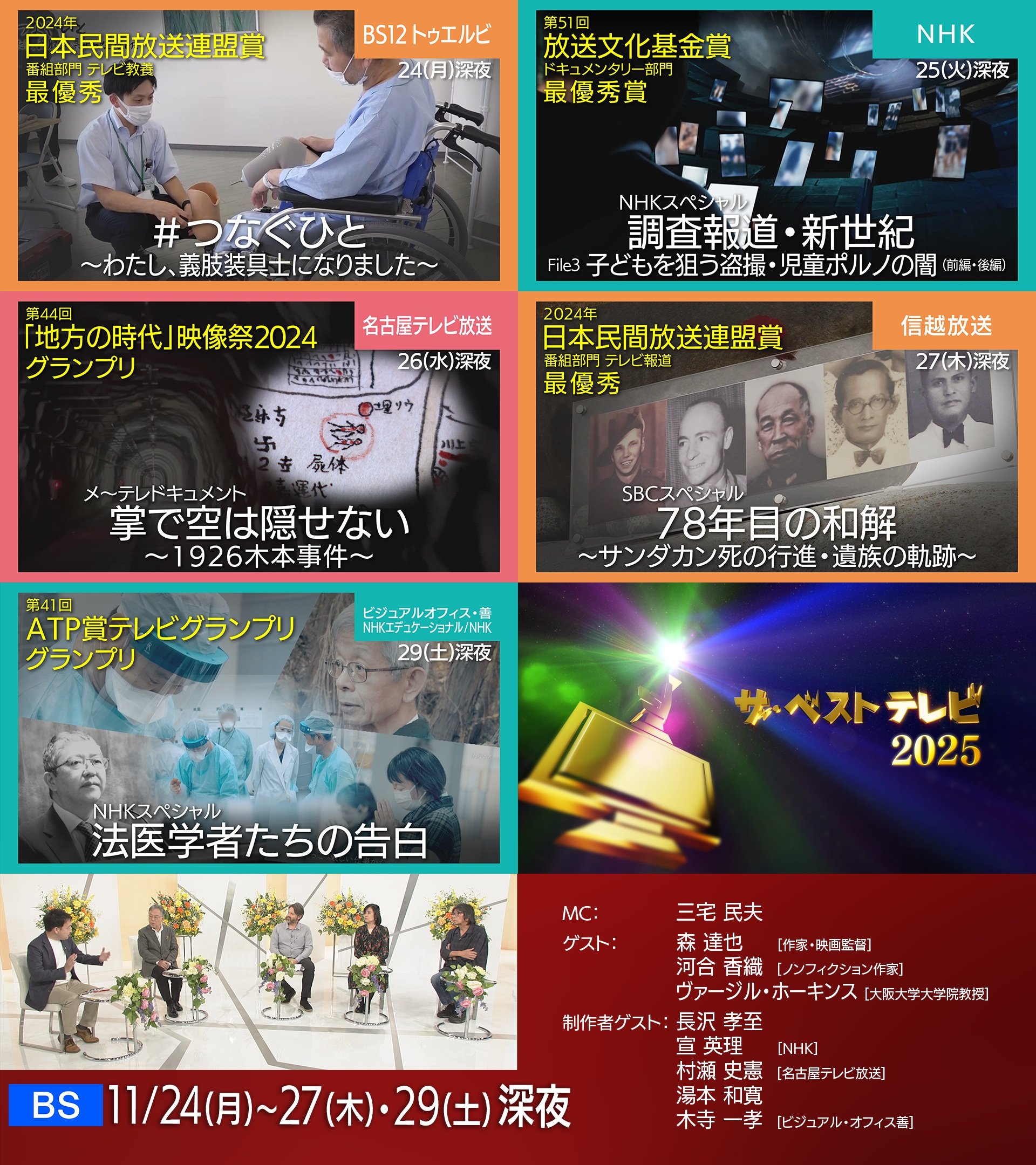 NHK BSの「ザ・ベストテレビ2025」は11月24日(月)-27日(木)・29日(土)の期間に、民放とNHKの5作品を全編放送。制作者から番組の見どころなどを聞く。ゲストは森達也(作家・映画監督)、ヴァージル・ホーキンス(大阪大学大学院教授)、河合香織(ノンフィクション作家)の各氏と各最高賞受賞作品の制作者。